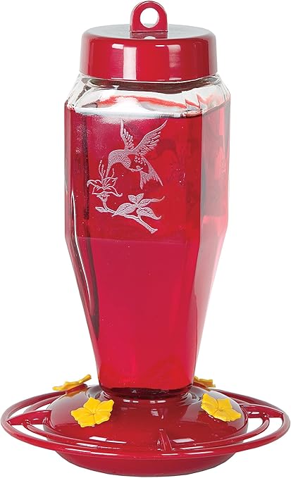The bright red hummingbird feeder 10 feeding ports are adorned in yellow flowers.